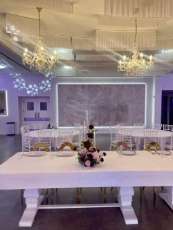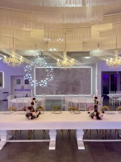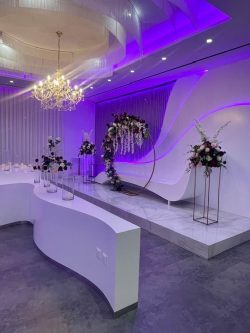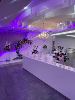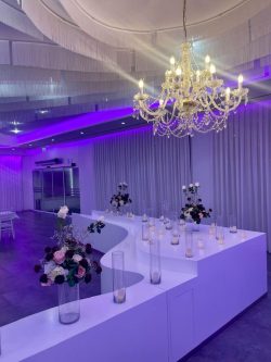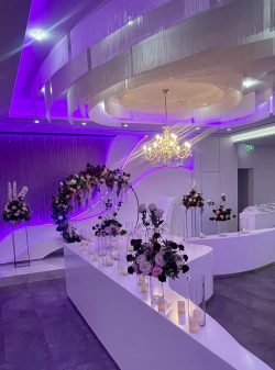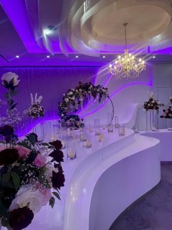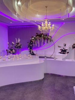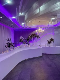 The space was transformed with soft ceiling draping and grand crystal chandeliers, adding depth, texture and timeless sophistication. Purple ambient lighting embraced the room, highlighting the architectural curves and creating a dramatic yet elegant mood.