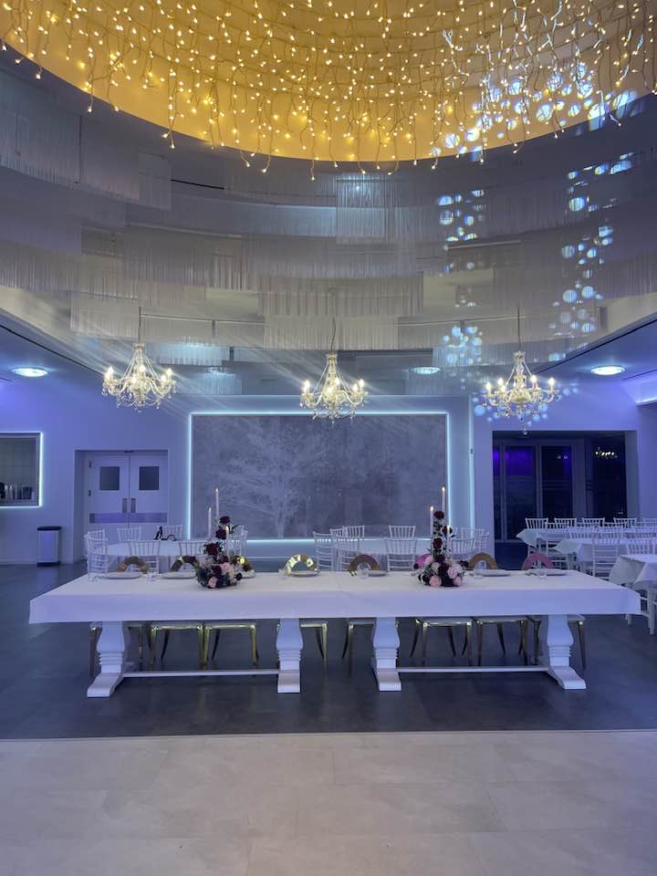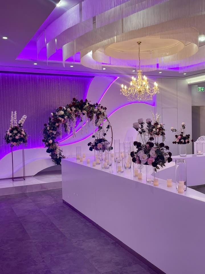 The space was transformed with soft ceiling draping and grand crystal chandeliers, adding depth, texture and timeless sophistication. Purple ambient lighting embraced the room, highlighting the architectural curves and creating a dramatic yet elegant mood.