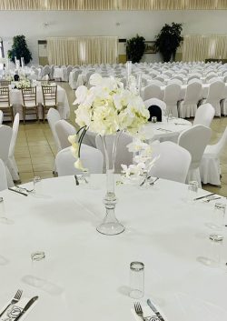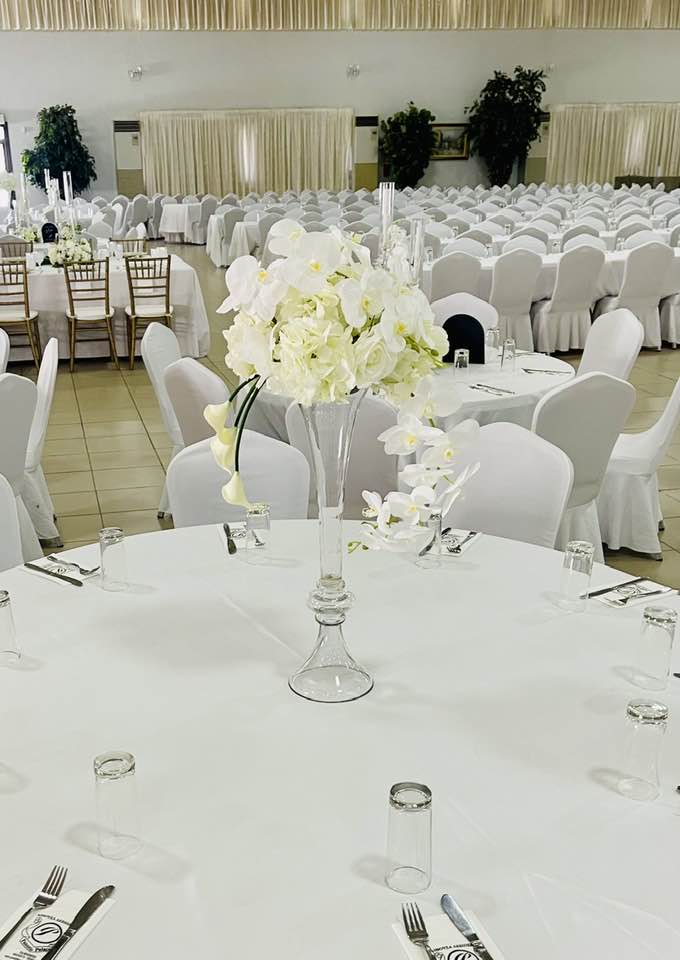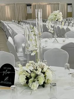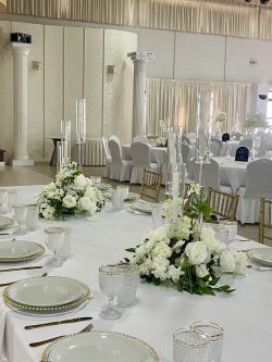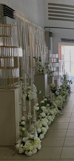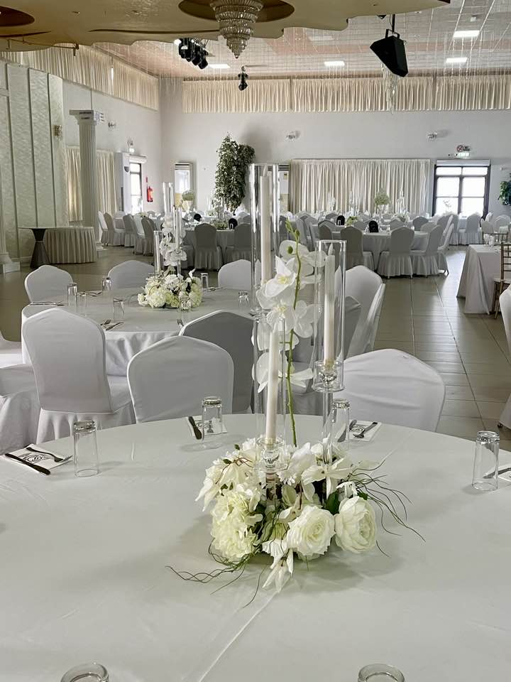 From the beautifully styled tables to the statement centerpieces with tall glass candles and delicate floral arrangements, every element was carefully curated to reflect refinement and harmony. White roses, orchids, and soft greenery blended seamlessly with the elegant décor, creating a light and graceful setting.