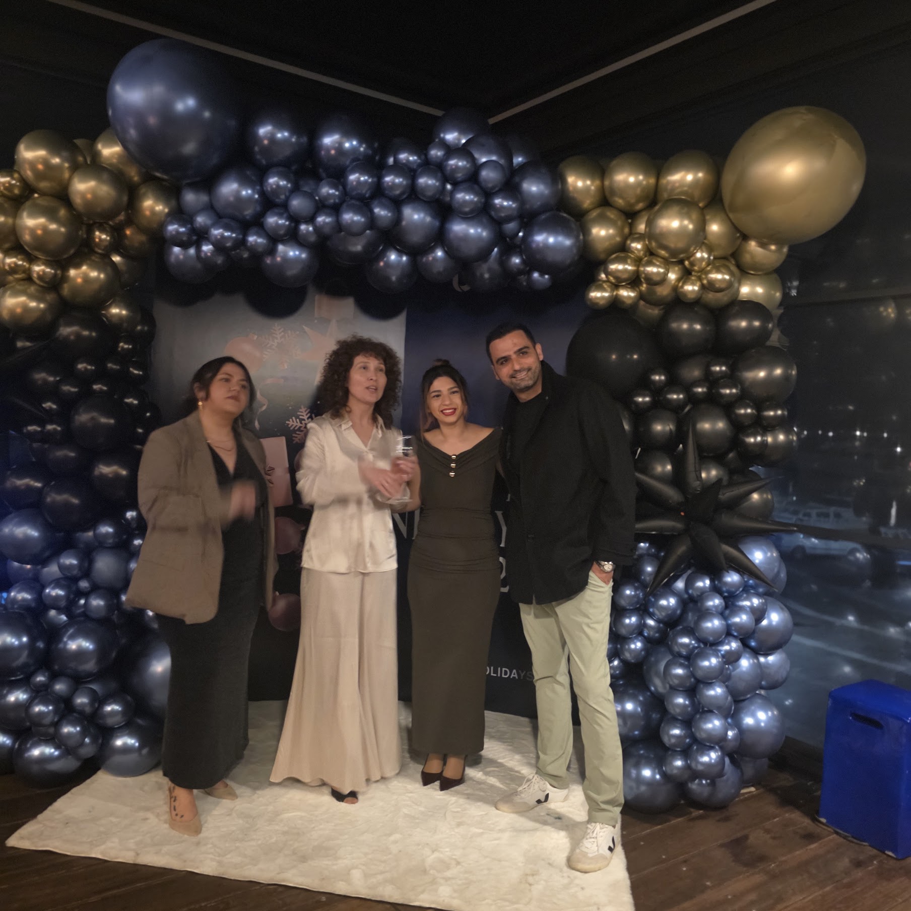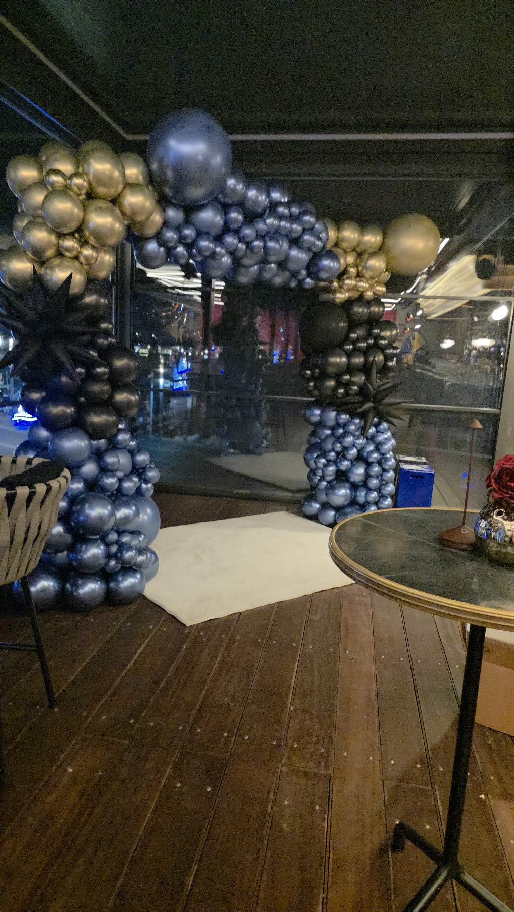 The entrance was transformed into a statement photo area featuring a luxurious balloon installation in metallic blue, deep black and champagne gold tones. The rich color palette created a powerful yet festive atmosphere — perfectly aligned with a forward-thinking tech brand.