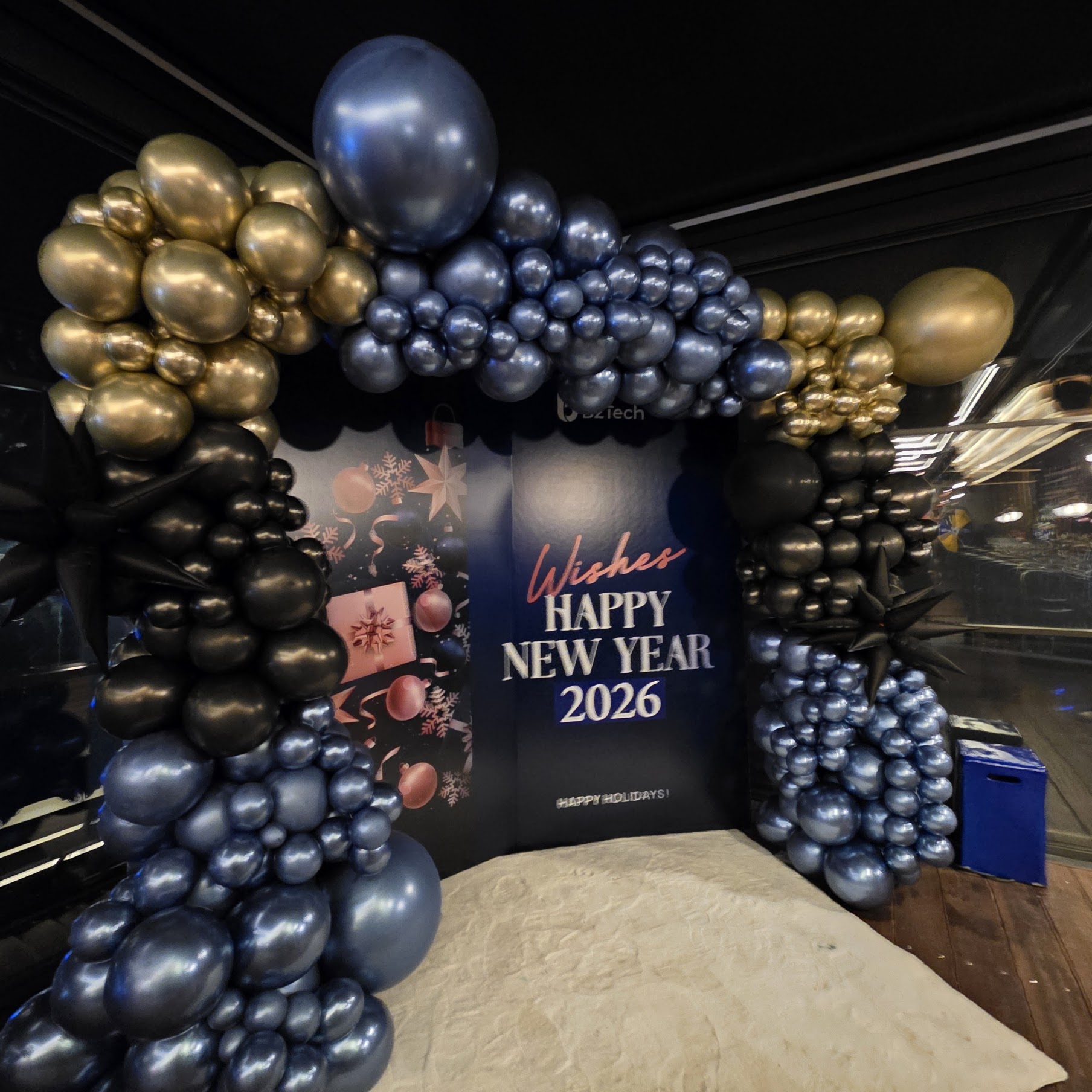 The structured balloon arch framed the custom “Happy New Year 2026” backdrop, offering guests the ideal spot to capture memorable moments as they welcomed the new year together.