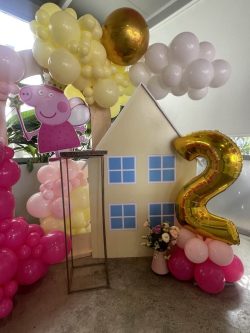 A custom pastel house backdrop created the perfect setting, combined with soft pink, blush, cream and yellow balloon installations that felt like fluffy clouds of happiness. The oversized gold number “2” added a glamorous touch, celebrating this special milestone in style.