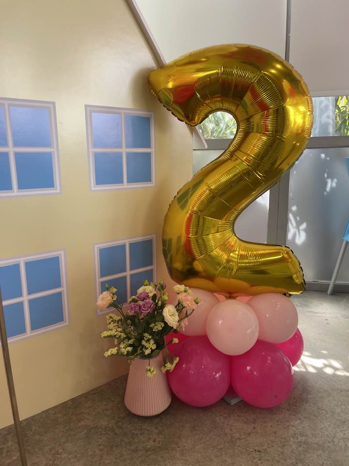 A custom pastel house backdrop created the perfect setting, combined with soft pink, blush, cream and yellow balloon installations that felt like fluffy clouds of happiness. The oversized gold number “2” added a glamorous touch, celebrating this special milestone in style.